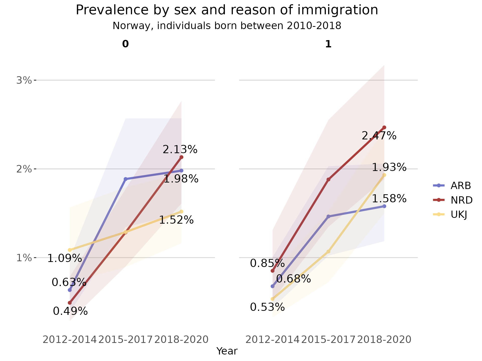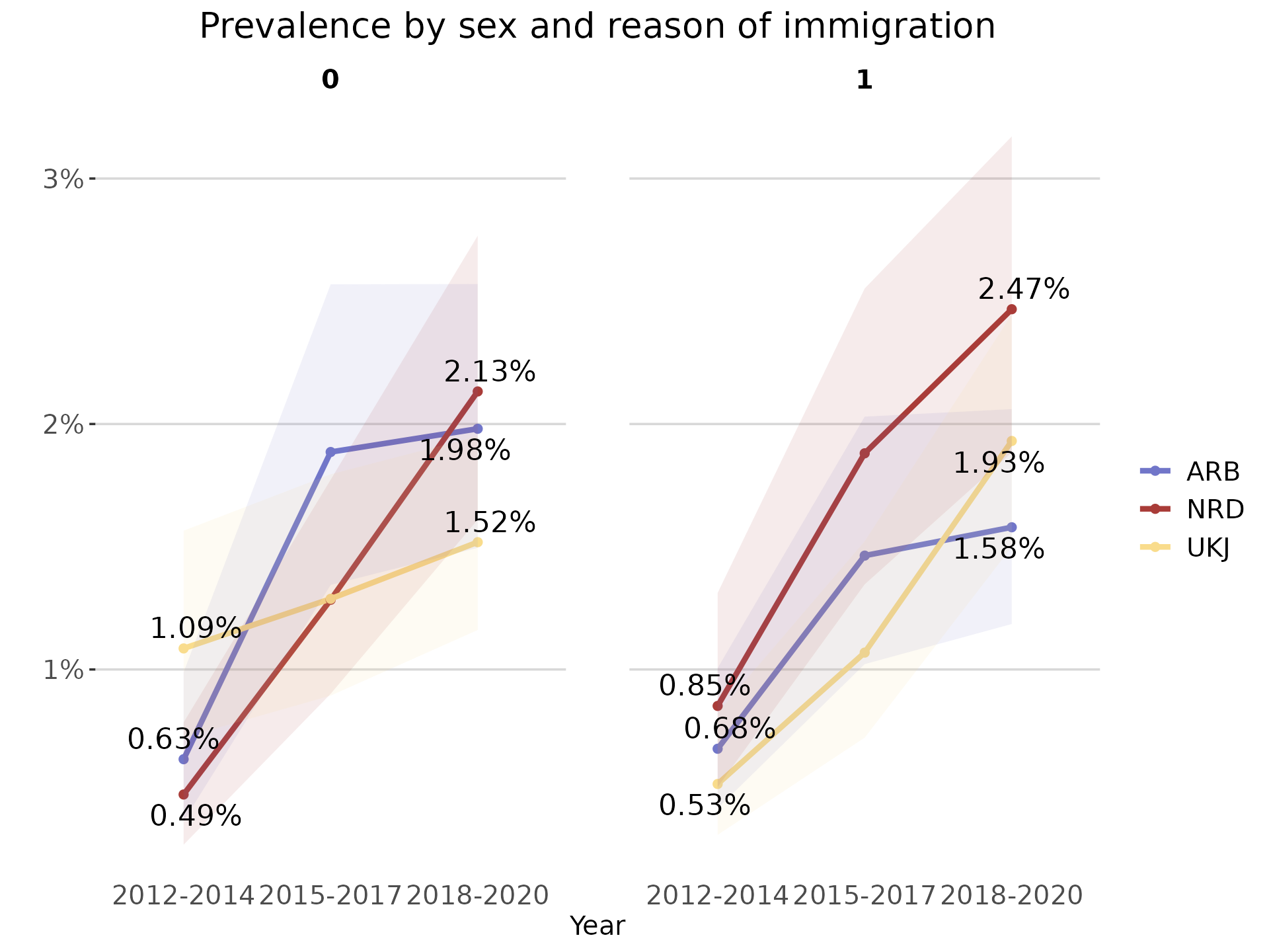 plot_title = "Prevalence by sex and reason of immigration",